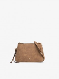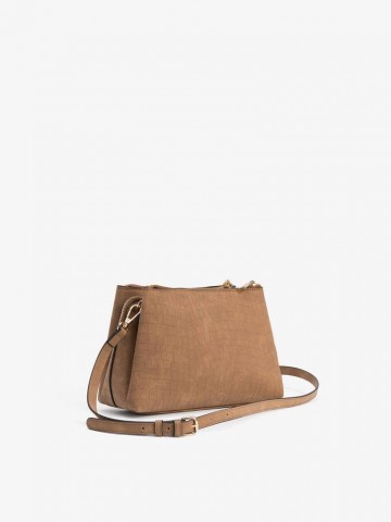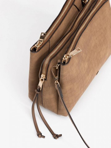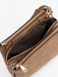 CARTEIRA CASTANHA COM PADRÃO TEXTURIZADO, FECHOS DOURADOS E ALÇAS AJUSTÁVEIS. DESIGN COMPACTO E MODERNO.
