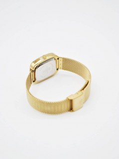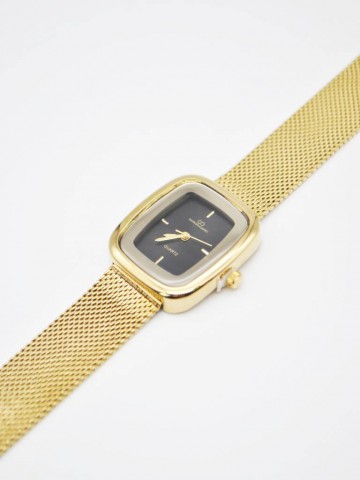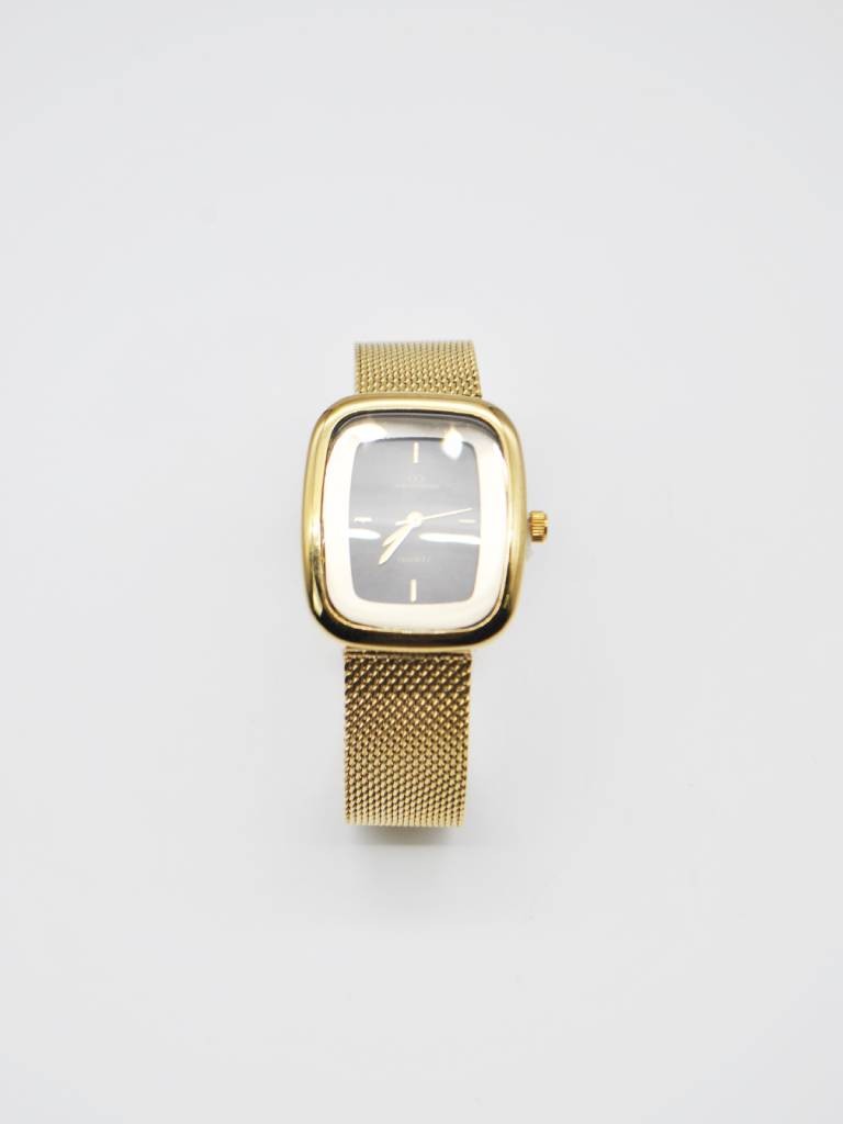 RELÓGIO ANALÓGICO COM MOSTRADOR QUADRADO DOURADO DE AÇO INOXIDÁVEL, DESTACANDO-SE PELA DURABILIDADE E ELEGÂNCIA