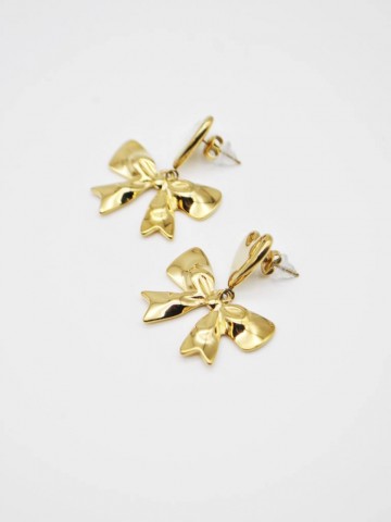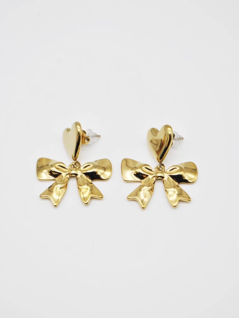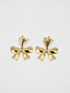 BRINCOS DOURADOS EM AÇO INOXIDÁVEL, COM PENDENTE EM FORMA DE CORAÇÃO E DETALHE DE LAÇO,DELICADOS E CHEIOS DE CHARME.