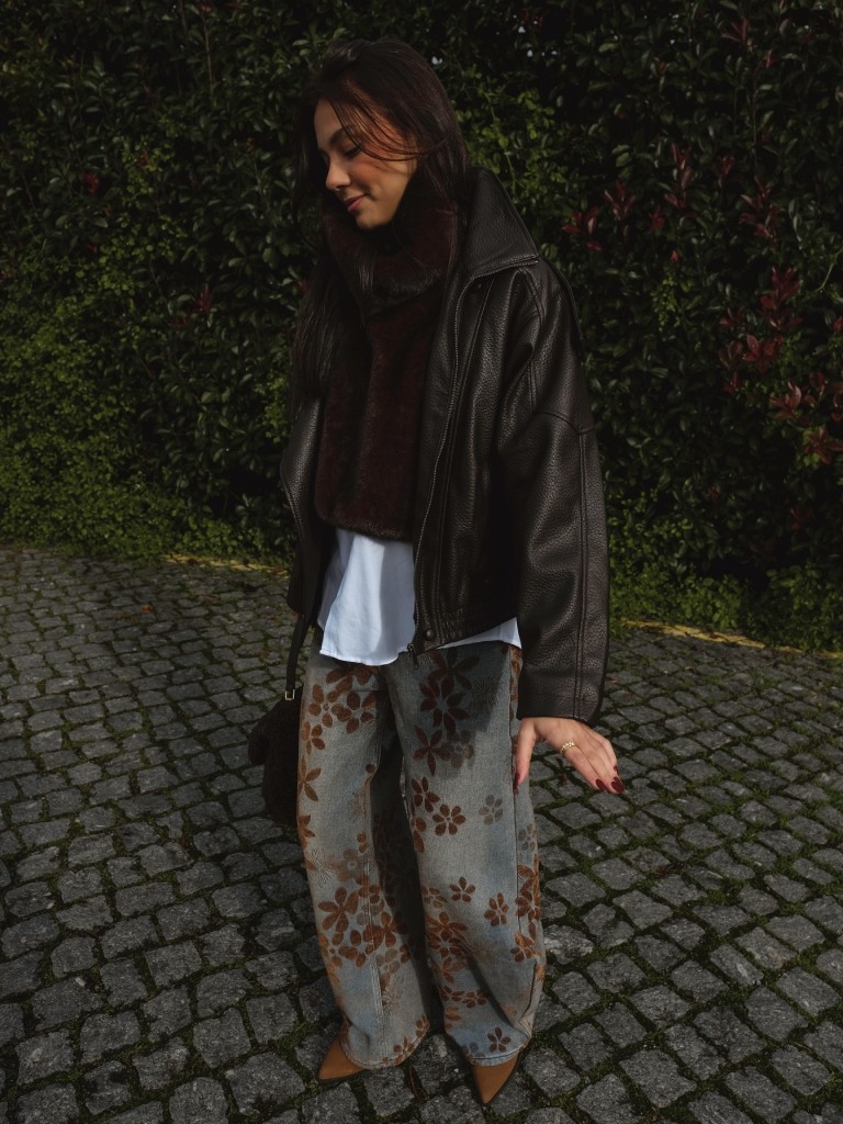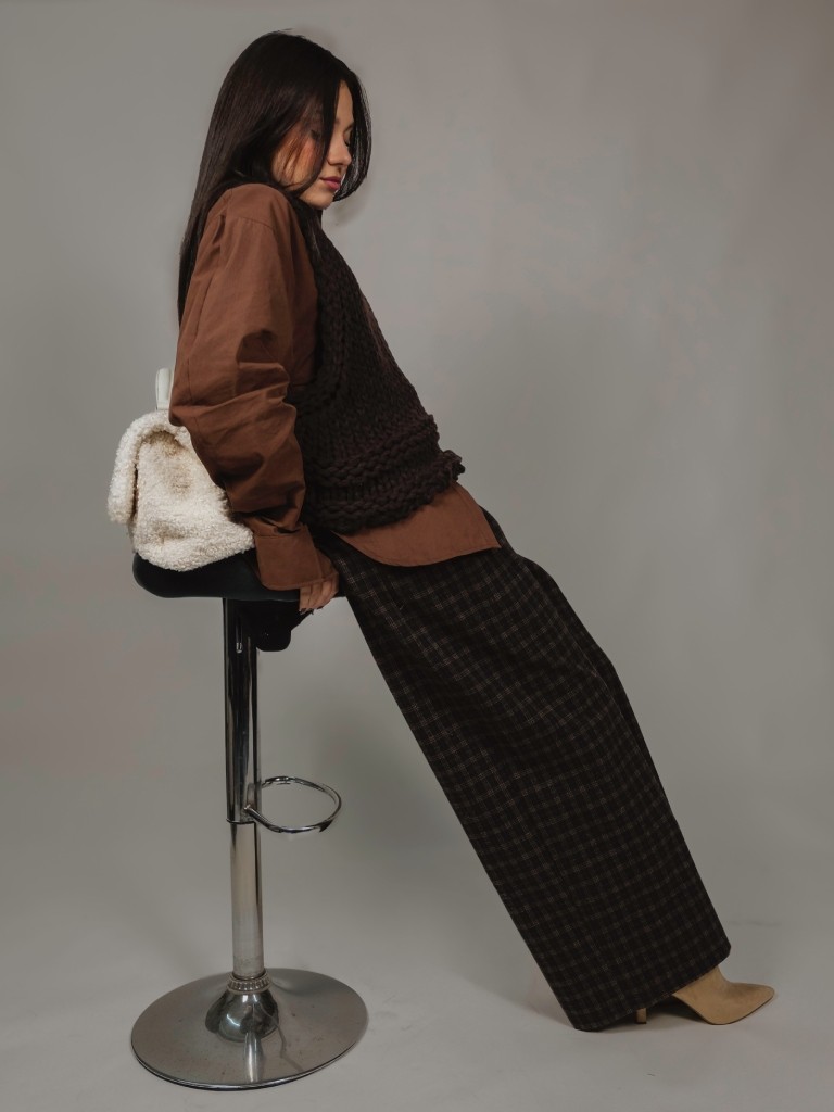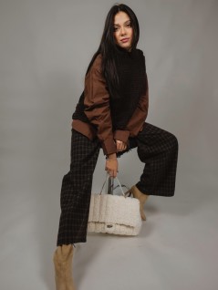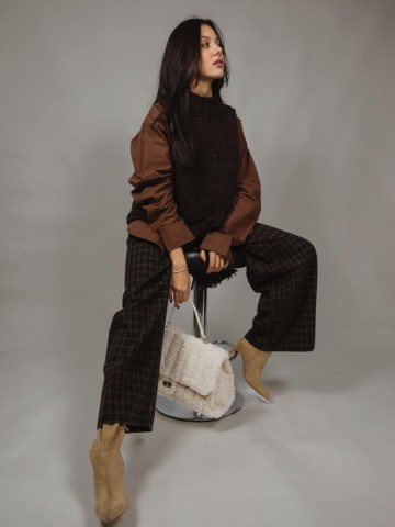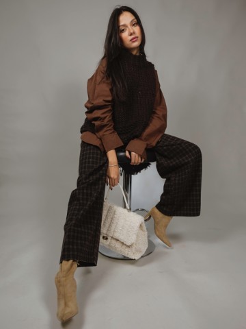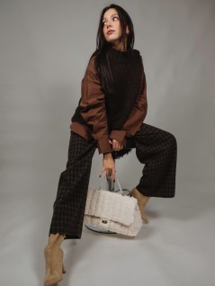 Calças com perna larga com quadrados. Fecho com colchete e fecho de correr. Bolsos laterais.