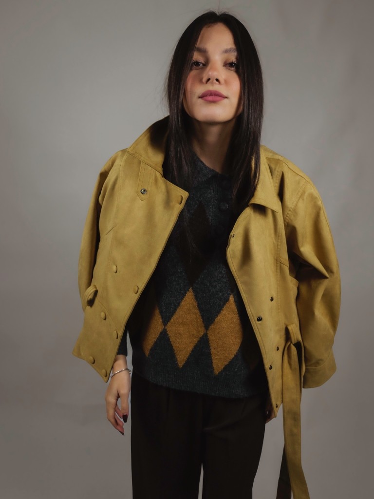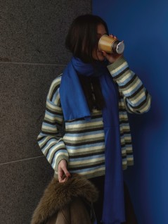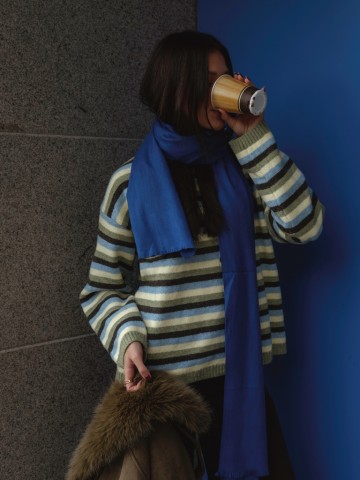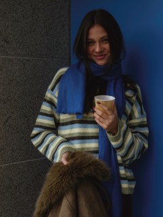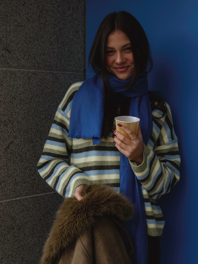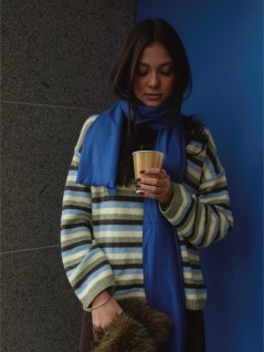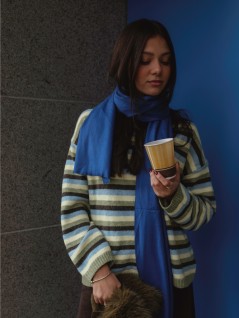 Casaco de malha com riscas multicolor. Fecho frontal com botões.
