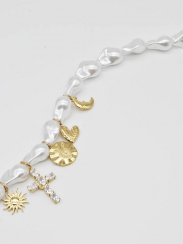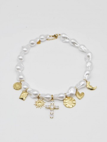 Adicionar à Wishlist Vista rapida COLAR DE PÉROLAS COM CRUZ 13,00 € Descrição: Colar de pérolas e contas amarelas. Pendente em formato de cruz. Composição: 100% Aço Inoxidável