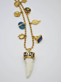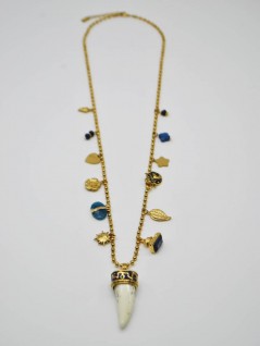 COLAR DE CONTAS DOURADO COM PENDENTES VARIADOS E AMULETO COM DETALHE AZUL , EM FORMA DE DENTE.