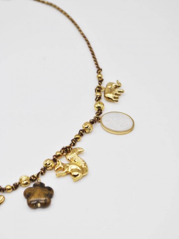 Colar de charms da sorte, composto por um corrente com missangas douradas com variados pingentes temáticos.