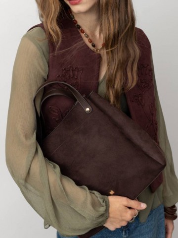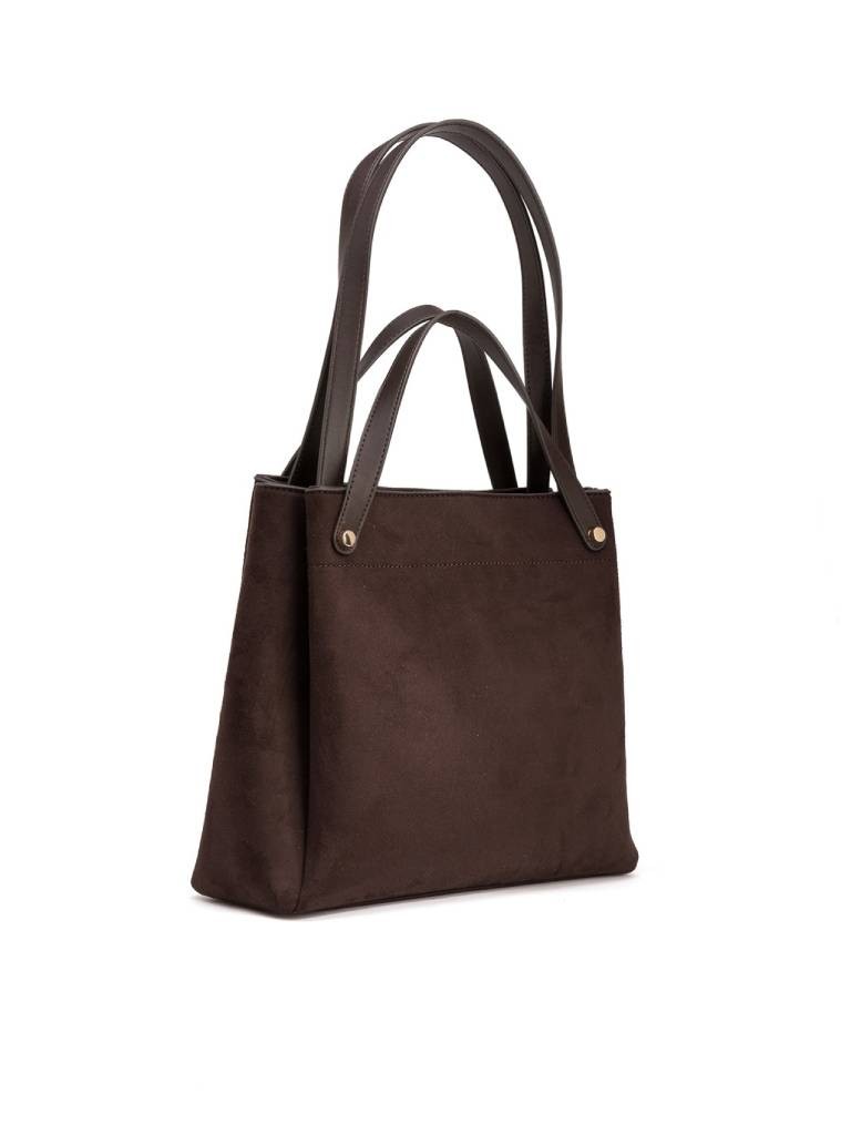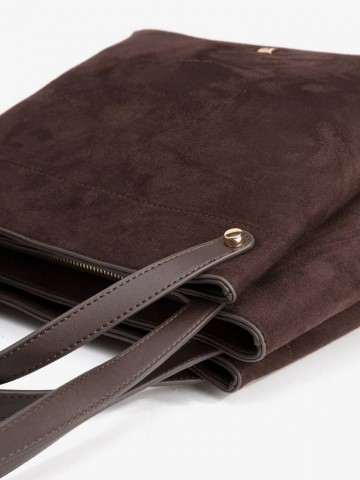 Mala shopper efeito camurça com três compartimentos, fecho de correr e fechos magnéticos. Alças de mão e de ombro fixas. Tamanho médio.