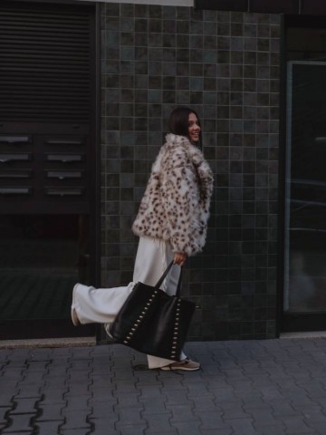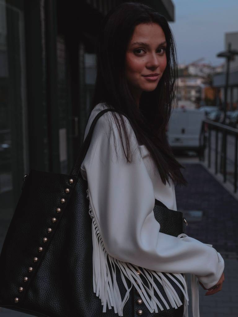 Mala shopper com tachas douradas. Alça tiracolo. Fecho de botão.