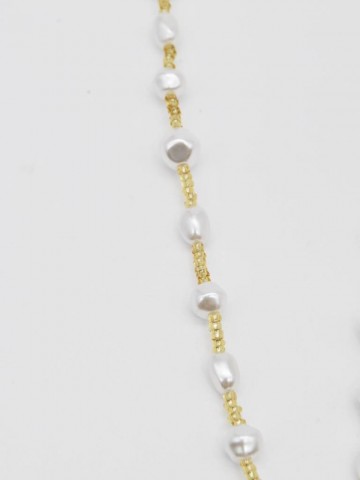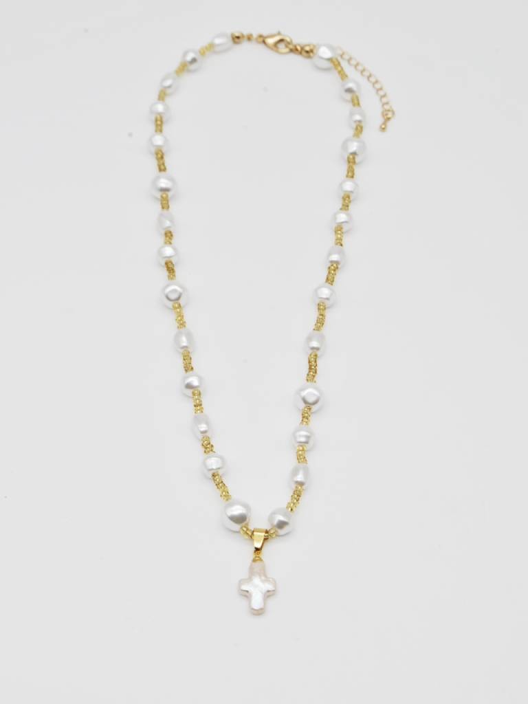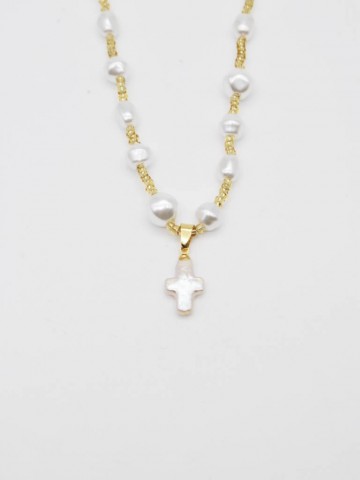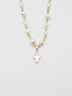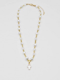 Colar de pérolas e contas amarelas. Pendente em formato de cruz.