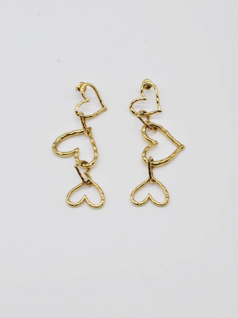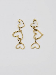 BRINCOS COMPRIDOS COM CORAÇÕES ENTRELAÇADOS E VAZADOS EM CASCATA COM EFEITO MARTELADO.