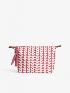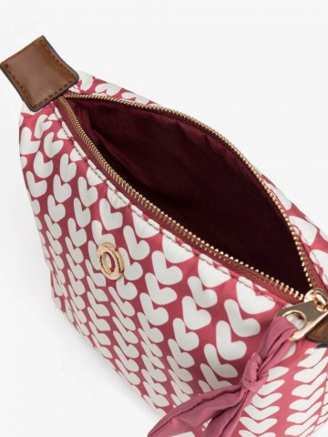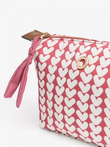 Descrição: Porta-moedas vermelho com padrão de corações brancos, fecho dourado e detalhe de laço lateral.