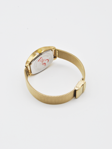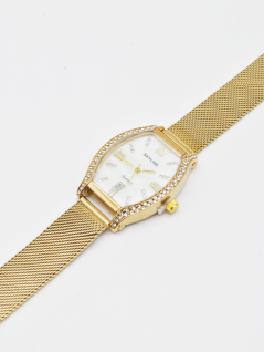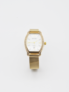 RELÓGIO ANALÓGICO COM MOSTRADOR DOURADO DE AÇO INOXDIÁVEL COM BRILHANTES, DESTACANDO-SE PELA DURABILIDADE E ELEGÂNCIA.