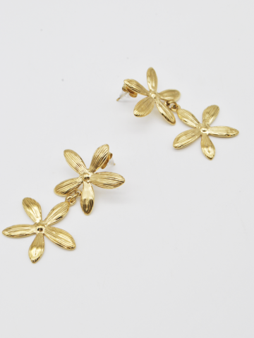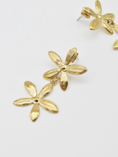 BRINCOS DOURADOS COMPRIDOS COM EFEITO DE FLOR.