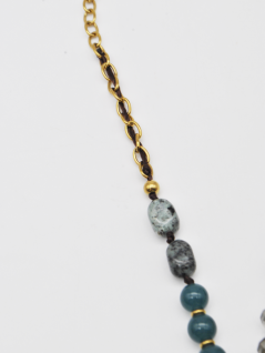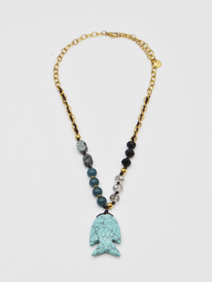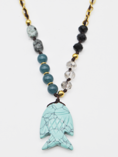 COLAR COM PEDRAS EM TONS DE AZUL E PRETO, EM RESINA, E PENDENTE DE PEIXE.