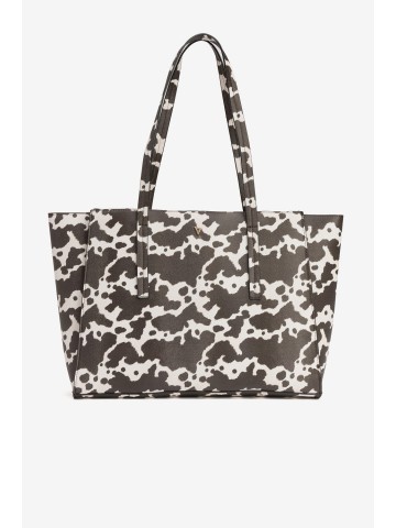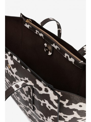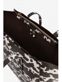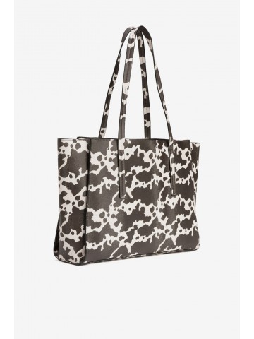 CARTEIRA LARGA TIPO TOTE COM PADRÃO ANIMAL EM CASTANHO E BRANCO, ALÇAS LONGAS E FECHO METÁLICO.