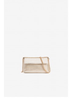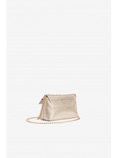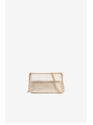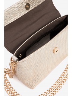 Bolsa compacta de cor prateada com fecho de mola e corrente dourada chunky de ombro.