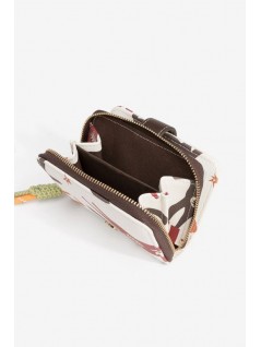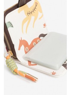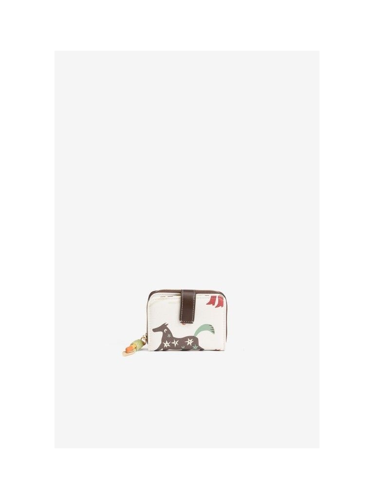 Porta-moedas de cor cru com padrão colorido de cavalos, fecho de pressão e compartimento interior com fecho.