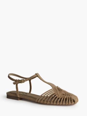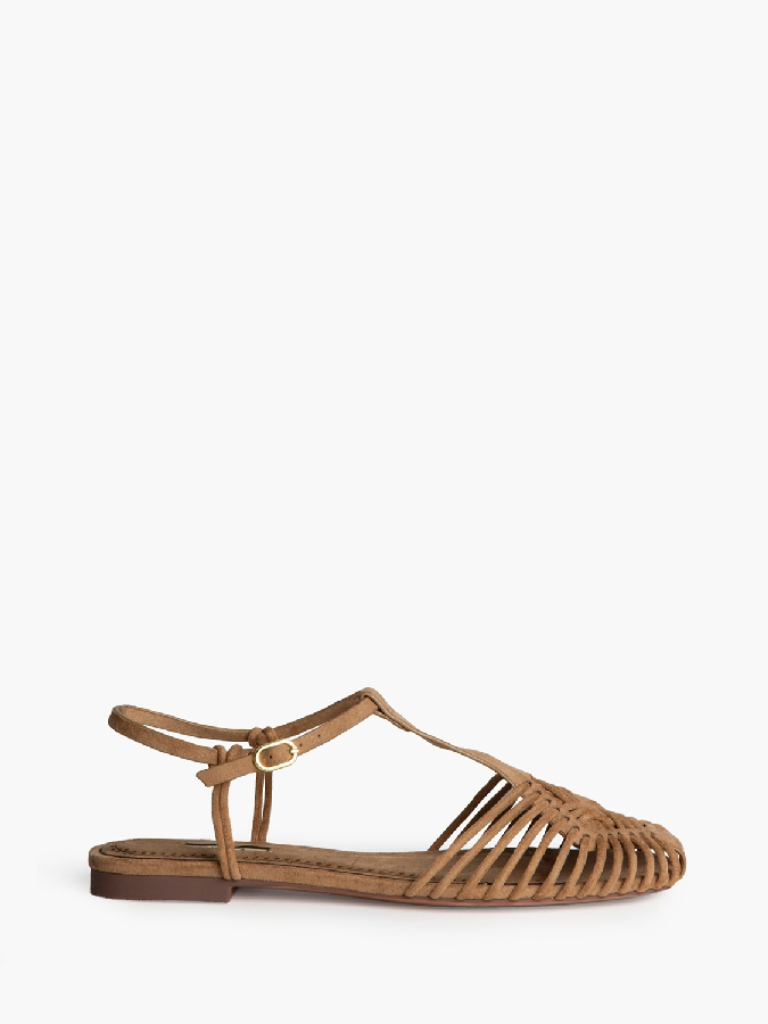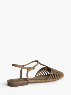 Sandália rasteira. Tiras finas. Fecho com fivela lateral.