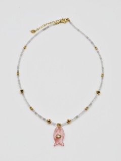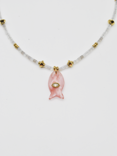 COLAR COM MICROCONTAS EM TONS DE BRANCO, EM RESINA, E PENDENTE DE PEIXE EM ROSA COM BRILHANTE.