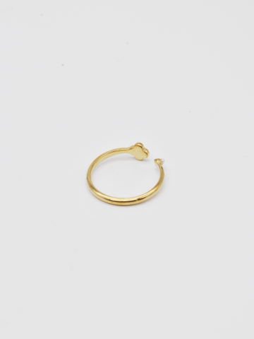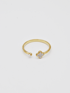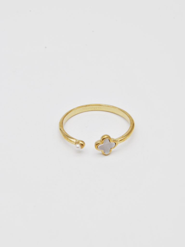 ANEL DOURADO COM PÉROLA PEQUENA E FORMATO DE TREVO.