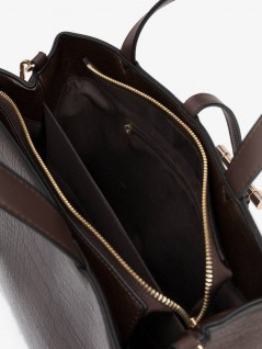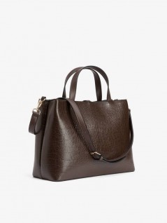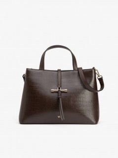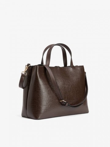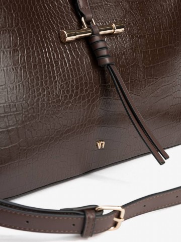 CARTEIRA CASTANHA COM TEXTURA CROCODILO,ALÇA AJUSTÁVEL E FECHO DOURADO.