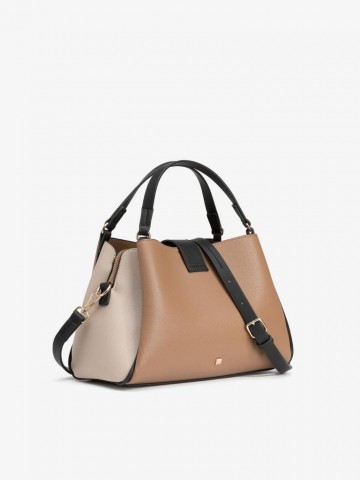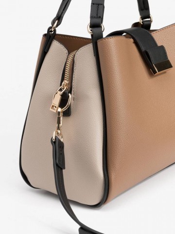 CARTEIRA CASTANHA COM ALÇA PRETA,COM FECHO DOURADO E DETALHES EM TOM BEGE CLARO.