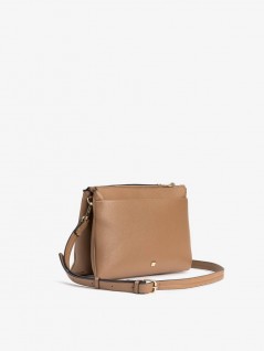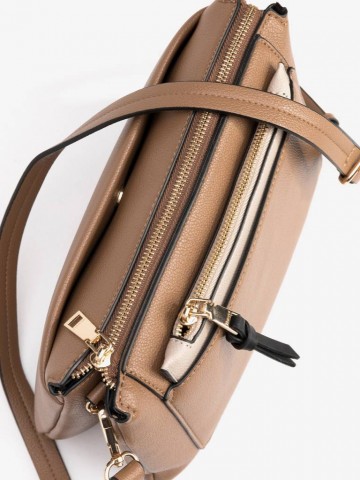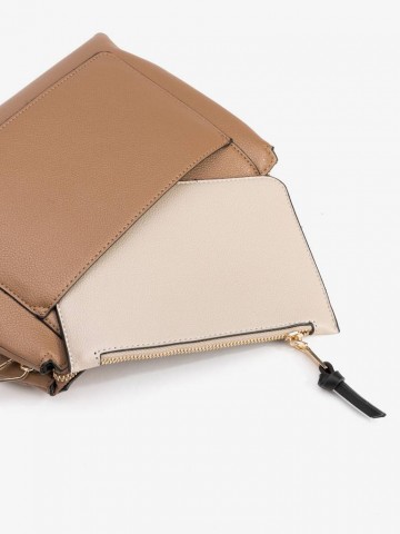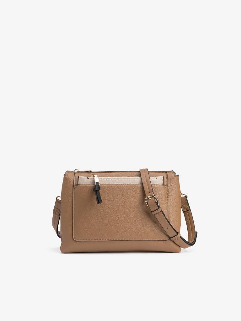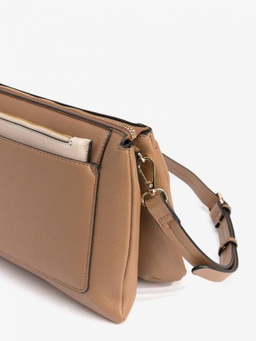 CARTEIRA CASTANHA COM ALÇA AJUSTÁVEL,BOLSO FRONTAL E FECHO DOURADO, INCLUI PORTA-MOEDAS BEGE