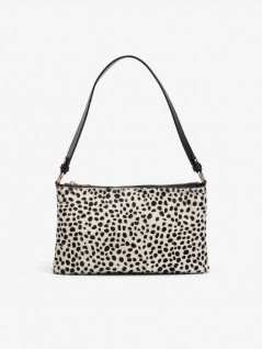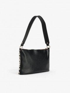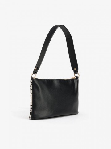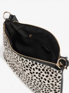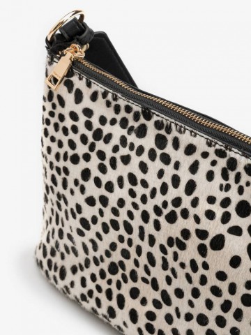 CARTEIRA COM PADRÃO ANIMAL EM PRETO E BRANCO, FECHO DOURADO E ALÇA PRETA REMOVÍVEL