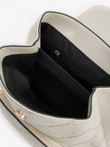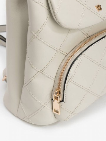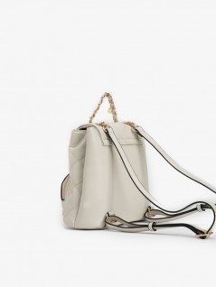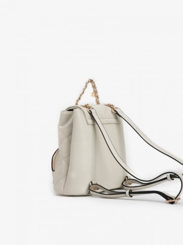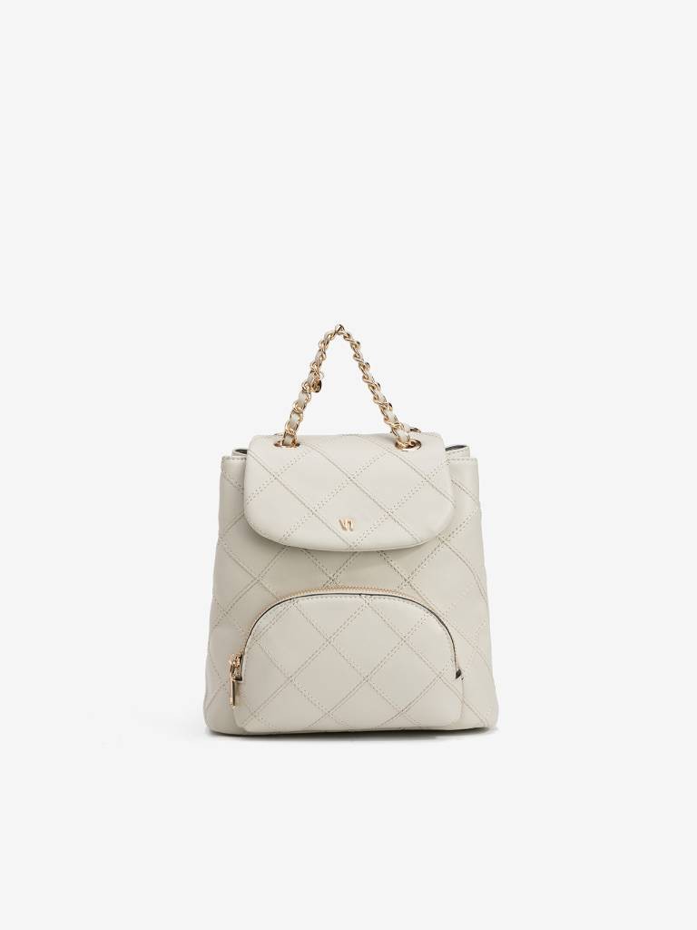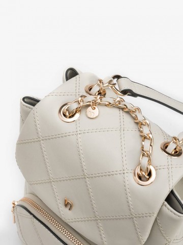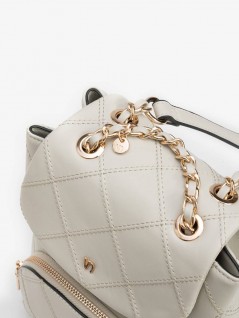MOCHILA BEGE COM PADRÃO ACOLCHOADO, ALÇA DE CORRENTE DOURADA E BOLSO FRONTAL COM FECHO.