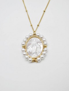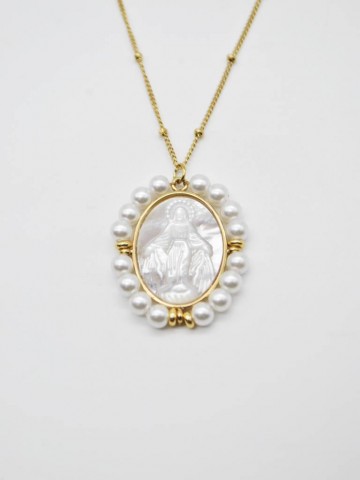 COLAR SANTINHA DOURADO COM PÉROLAS , COM MEDALHA NO FORMATO OVAL .