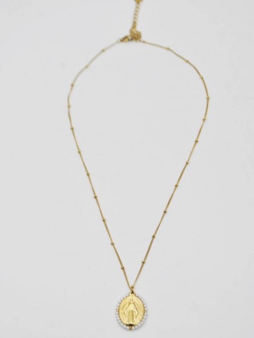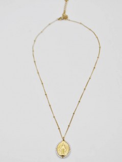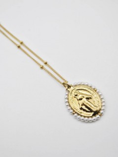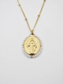 COLAR SANTINHA DOURADO COM RELEVO DETALHADO E CERCADURA DE PÉROLAS.