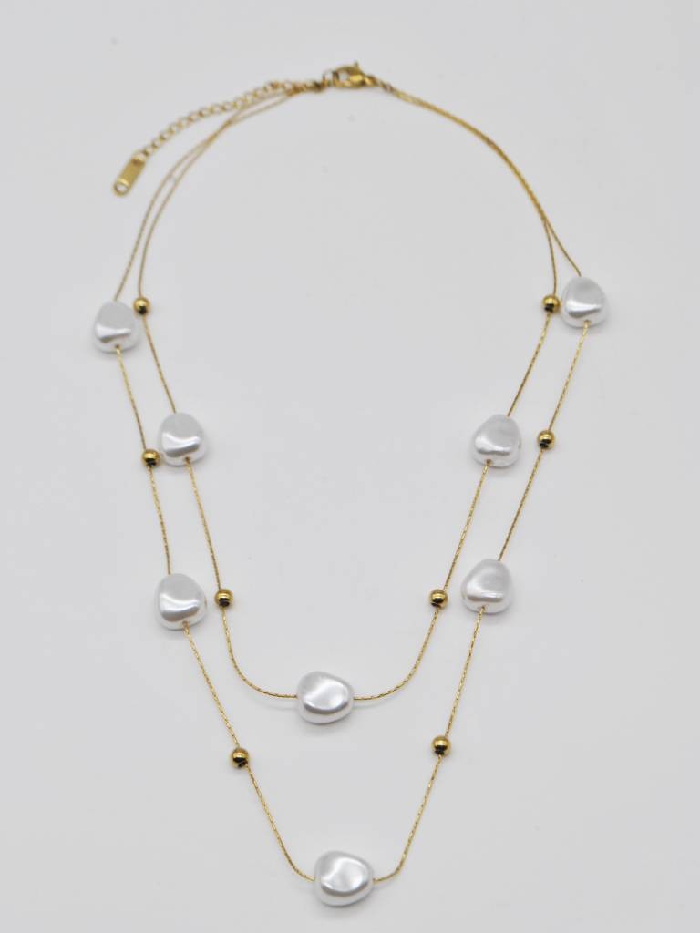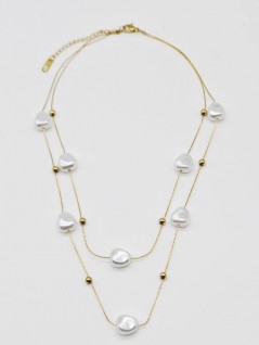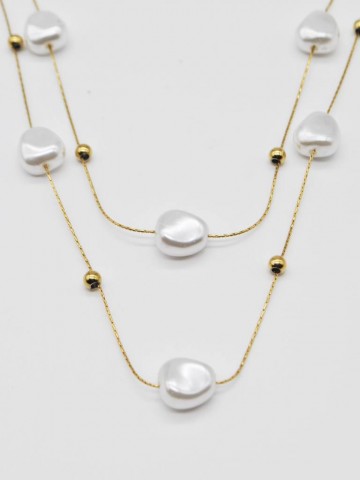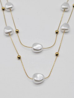 COLAR COM DUAS CORRENTES FINAS DECORADAS COM CONTAS BRANCAS DE FORMATO IRREGULAR.