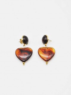 BRINCOS COM PENDENTES COMPOSTOS POR UMA BASE CIRCULAR SUPERIOR E UM PENDENTE EM FORMATO DE CORAÇÃO , COM NUANCES EM TONS DE ÂMBAR, MEL E CASTANHO.