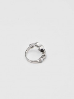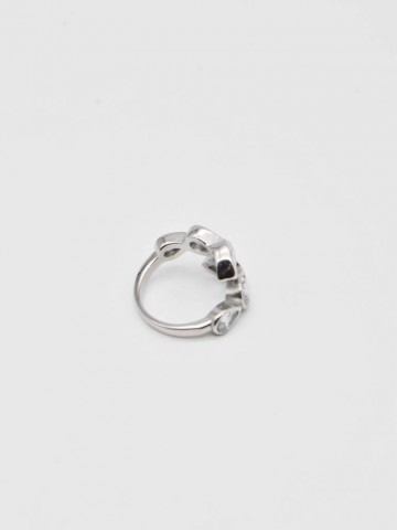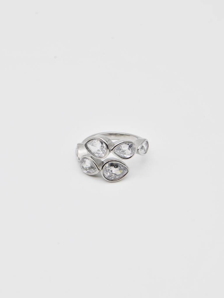 ANEL PRATEADO DE ARO FINO COM UM CONJUNTO DE CRISTAIS EM FORMATO DE GOTA DISPOSTOS EM FLOR.