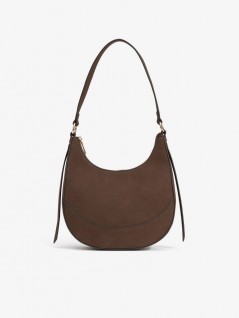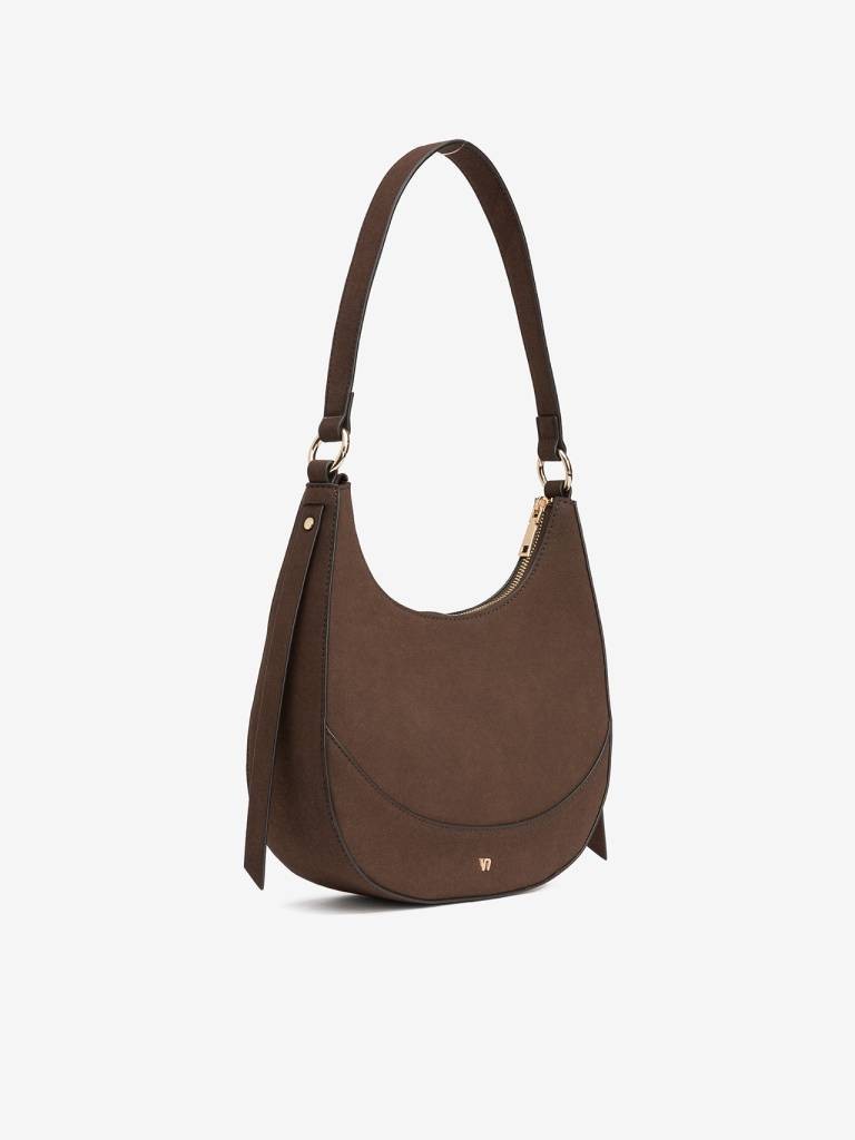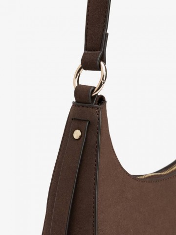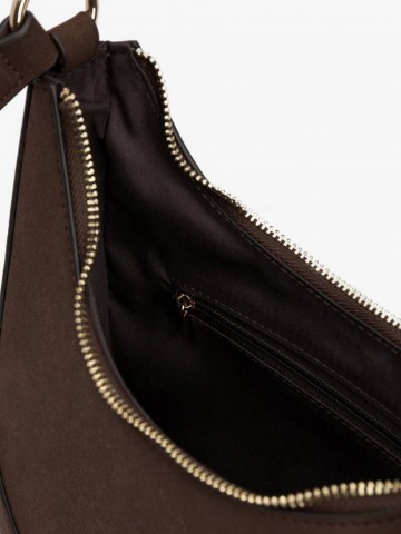 CARTEIRA CASTANHA COM FECHO DOURADO, ALÇA AJUSTÁVEL E DESIGN CURVO. INTERIOR ESPAÇOSO E PRÁTICO.