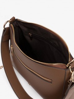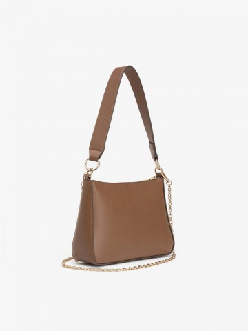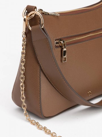 CARTEIRA CASTANHA COM CORRENTE DOURADA, FECHO METÁLICO E BOLSO FRONTAL COM ZÍPER.