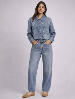 Camisa de ganga com estampado de cavalos. Gola com colarinho com renda à volta. Bolsos dianteiros. Fecho frontal com botões. Corte direito.
