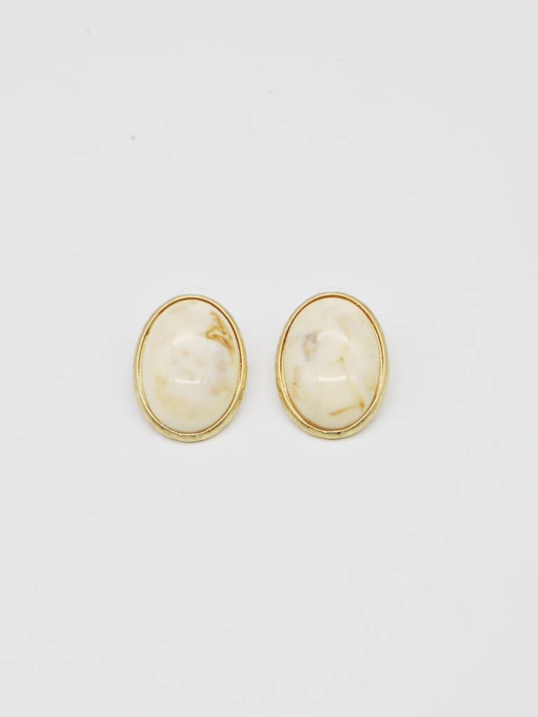 BRINCOS OVAIS COM EFEITO MÁRMORE EM TONS CREME E MOLDURA DOURADA MINIMALISTA.