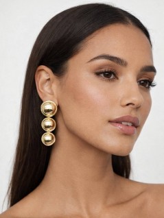 BRINCOS DOURADOS COM DESIGN DE TRÊS ESFERAS POLIDAS EM TAMANHOS DECRESCENTES.