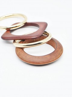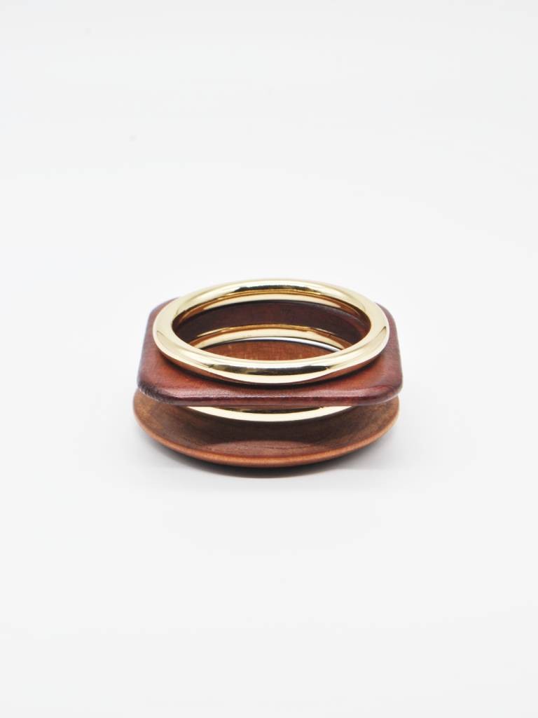 MIX DE PULSEIRAS RÍGIDAS QUE COMBINA O ASPETO METALIZADO DE ARGOLAS DOURADAS COM A ELEGÂNCIA NATURAL DE PEÇAS EM MADEIRA DE DIFERENTE TONS.