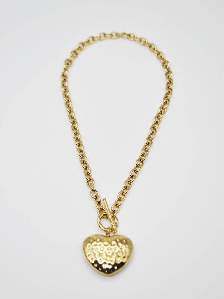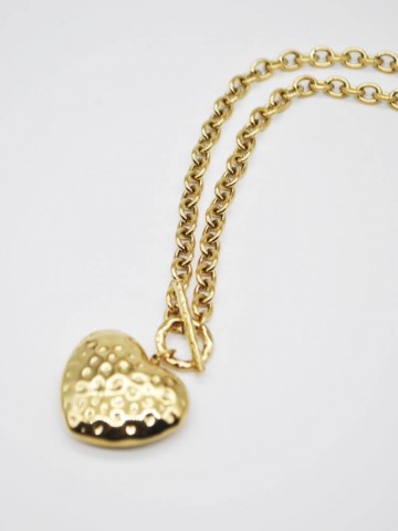 COLAR DOURADO DE CORRENTE COM ELOS CLÁSSICOS, POSSUI FECHO FRONTAL E UM PENDENTE DE CORAÇÃO EM RELEVO COM TEXTURA MARTELADA .