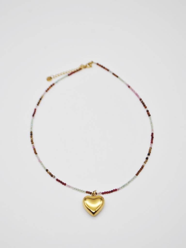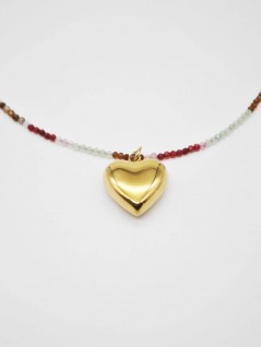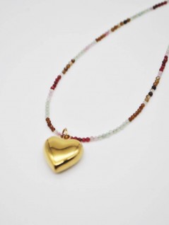 COLAR DELICADO COM MICROCONTAS COLORIDAS E PENDENTE DE CORAÇÃO DOURADO.