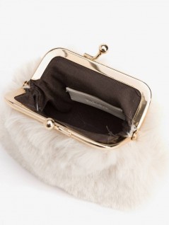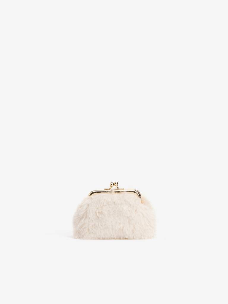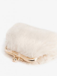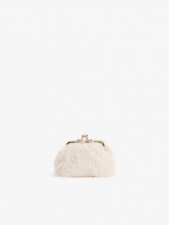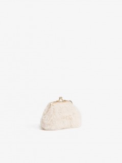 PORTA-MOEDAS DE COR CRU COM TEXTURA PELUDA E FECHO METÁLICO DOURADO, INTERIOR FORRADO A TECIDO ESCURO.