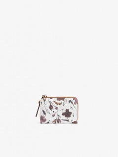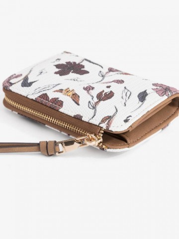 PORTA-MOEDAS COMPACTO COM PADRÃO FLORAL EM TONS DE CASTANHO E DOURADO.