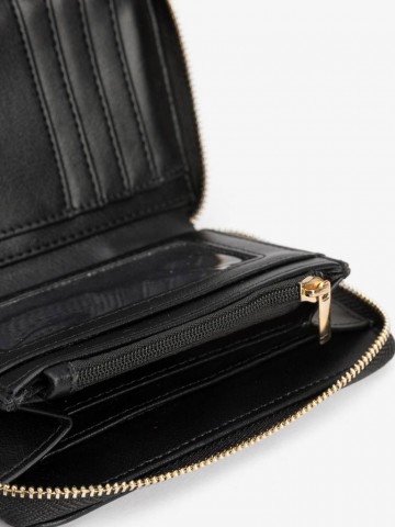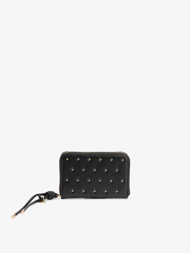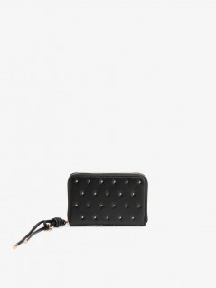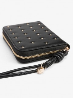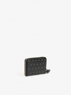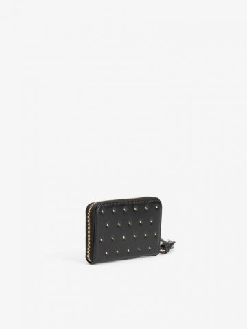 PORTA-MOEDAS PRETO COM TACHAS DOURADAS, FECHO DE CORRER E COMPARTIMENTOS INTERNOS ORGANIZADOS.