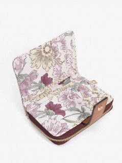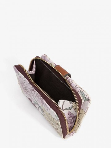 Descrição: Porta-moedas com padrão floral em tons suaves, fecho de correr e detalhe castanho elegante.