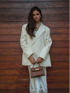 Saia midi em cetim cor creme com o final rendado. Forro no interior. Fecho lateral invisível.